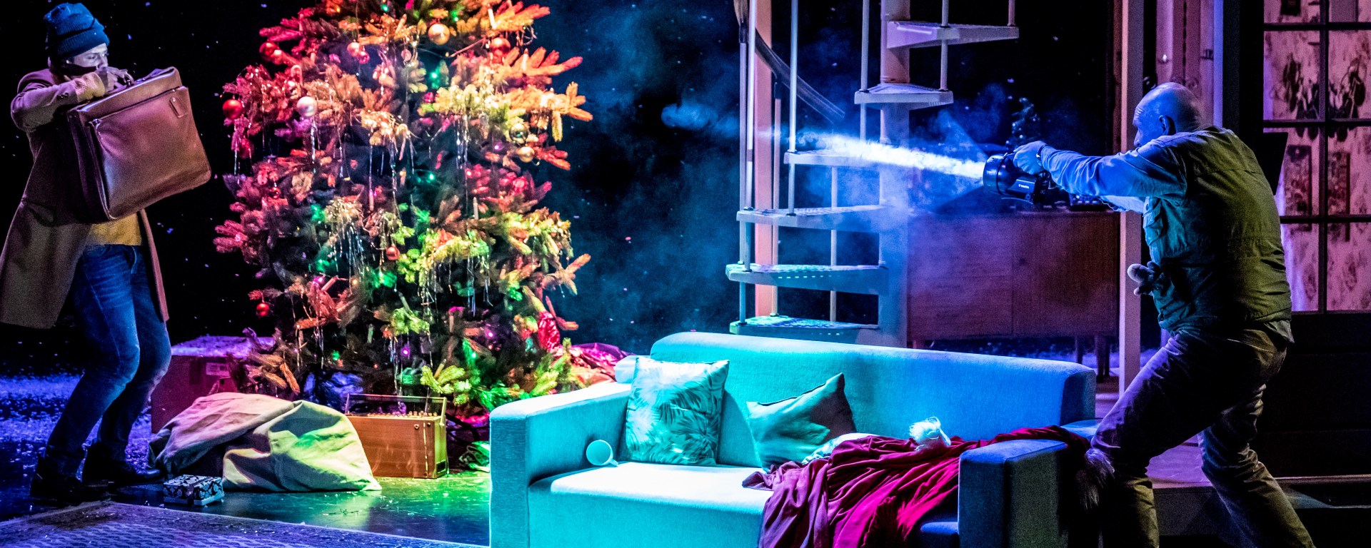 Ein Haus, eine Familie, aber alle könnten unterschiedlicher nicht sein. Jeder von ihnen ist speziell. Diese Mischung harmoniert aber hervorragend und das ist genau das, was diese Inszenierung zu einem besonderen Spaß macht. Obwohl die Familien ein schönes Fest für ihre Kinder auf die Beine stellen wollen, sind diese im Stück selbst nie zu sehen. Nein, es geht um die Großen. Ayckbourn lässt eine Menge an britischem Humor mit einfließen, welcher fantastisch von den Darstellern verkörpert wird. Jeder von ihnen ist in seinem Element. Das Bühnenbild, welches von Jan Hendrik Neidert entworfen wurde, bietet einen großen Schauplatz – und es passiert viel. Allein wenn Léa Wegmann als Phyllis in der Küche steht, ist das Zusehen ein wahrer Genuss für das Publikum. Auch die Rolle von Burkhard Wolf bringt viele Lacher mit. Antonia Schirmeister als Belinda ist eine wahre Göttin der Verführung. Man bekommt richtig Mitleid mit Maike Schroeter als Rachel, die es einfach über sich ergehen lässt, wie ihre eigene Schwester versucht, ihren Clive zu verführen. Jeder ist in seinem Element. Eigentlich handelt es sich um Themen, die viele Familien selbst kennen – nur an manchen Stellen etwas zu überspitzt. Marian Kindermann als Eddie hat sich beispielsweise noch immer nicht wirklich daran gewöhnt, dass er jetzt ein wenig mehr Verantwortung übernehmen muss und chillt deswegen lieber auf der Couch und chillt mit einem Comic, welcher für seine Kinder unter dem Weihnachtsbaum liegt. Und auch Zlatko Maltar und Uwe Fischer sind in ihren Rollen tief im Inneren noch kleine Jungs, die es mögen zu spielen. Marie Ulbricht versucht zumindest das Kind aus Eddie auszutreiben und deswegen reagiert sie als Pattie wie jede (schwangere) normale Frau. Kurz und knapp: Jeder Schauspieler beherrscht seine Rolle ausgezeichnet.