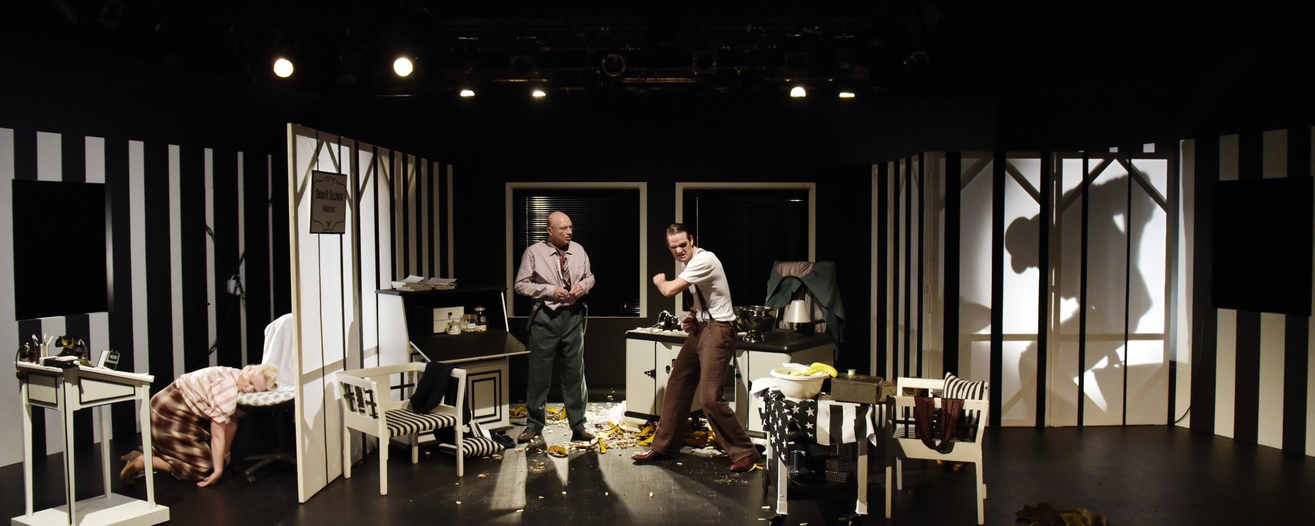 Wenn man ins Kino geht und sich einen Film ansieht, lässt man sich einfach berieseln und denkt meistens nicht daran, wie viel Schweiß man bei solchen Produktionen vergießt und wie viele Auseinandersetzungen es vielleicht gibt, damit das Publikum das Bestmögliche zu sehen bekommt. Gleiches gilt auch für das Theater. Mit „Mondlicht und Magnolien“ bietet Hutchinson den Zuschauern die Möglichkeit, auf eine charmante Art und Weise einmal hinter die Kulissen einer Entstehungsgeschichte zu schauen. Dass es sich dabei um Übertreibungen handelt, sollte jedem bewusst sein. Regisseurin Ruth Messing und Dramaturgin Laura Busch brachten in der Spielzeit 2016/2017 die Hollywood-Boulevardkomödie auf die Bühne des Schauspielhauses – mit Erfolg. Zusammen mit der Bühnen- und Kostümbildnerin Theresa Klement erschufen sie eine kleine Traumfabrik Hollywoods in Form eines Büros, welches sich in den rund 90 Minuten immer mehr zu einem Schlachtfeld verwandelt. Es fliegen Bananen und Erdnussschalen durch die Gegend, genau wie verbale Auseinandersetzungen. Die Protagonisten sind schließlich fünf Tage von der Außenwelt abgeschottet. Wen würde solch eine Situation nicht unter Druck setzen? Stress ist vorprogrammiert und der Stress breitet sich auch von Tag zu Tag immer mehr aus. Viele Aussagen sind nicht nur komisch, sondern auch nachvollziehbar. So oder so ähnlich könnten sich tatsächlich einige Stresssituationen unter Männern abspielen. Dazu trägt die großartige Besetzung bei.