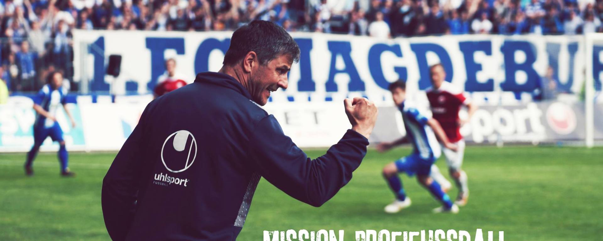 Rückblick: Nach der schlechtesten Saison der Vereinsgeschichte startet der 1. FC Magdeburg wieder einmal einen Neuanfang. Trainer Andreas Petersen soll den Verein nach 20 Jahren im bitteren Amateurfußball wieder zum Erfolg verhelfen. Dieses gelingt ihm auch. Doch im März 2014 verspielt der Verein mit 2:1 den Aufstieg gegen den TSG Neustrelitz. Trotz der erneuten Pleite war die Hoffnung weiterhin groß, den großen Sprung zu schaffen. Die FCM-Legenden Martin Hoffmann, Ulrich Schulze und Wolfgang Seguin sehen auch 2014 noch immer Potential, das Stadion wieder voll zu kriegen und Fußballgeschichte zu schreiben. Und dann kam Jens Härtel, der 20. Trainername nach der Wende. Er entwickelte ein neues System: Durch aggressives Pressing und modernes Umschaltspiel soll der FCM den Sprung in die 3. Liga schaffen. Anfangs war es nicht leicht umzusetzen. Doch irgendwann platzte der Knoten. Zwar schied der Verein gegen den ewigen Rivalen Hallescher FC im Halbfinale des Landespokals aus, doch der Traum vom Profifußball kam immer näher. Im Mai 2015 wurde dieser lang ersehnte Traum endlich Wirklichkeit. Der 1. FC Magdeburg hat wieder einmal Geschichte geschrieben und startet in Liga 3 durch.