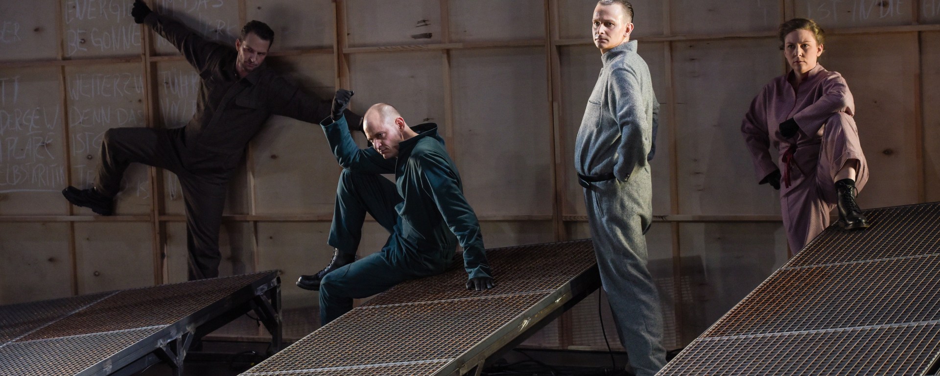 Bemerkenswert ist, dass die verschiedenen Figuren von nur fünf Schauspielern verkörpert werden. Dabei spielen deutlich mehr als fünf Protagonisten eine Rolle in der Produktion. Die Darsteller müssen stetig ihre Charaktere wechseln. Dabei geht es nicht nur um bedeutende Persönlichkeiten der Zeitgeschichte, sondern auch eigens für die Inszenierung kreierte Figuren, welche die Handlung sinnvoll vorantreiben sollen. Dies gelingt ihnen äußerst gut, doch leider nicht ausreichend. Dies kann möglicherweise daran liegen, dass ihnen viel zu wenig Hilfsmittel geboten werden, um mehr Klarheit beim Rezipienten zu schaffen. Es ist nicht verwunderlich, wenn so mancher Part durch die vielen Dialoge und Monologe untergeht, weil die Ereignisse rastlos sind und eine neue Handlung direkt an eine weitere anknüpft. Und um wen geht es da gerade eigentlich? Das Unterscheiden der einzelnen Akteure ist teilweise schier unmöglich, da die Wechsel meistens abrupt erfolgen. Den Schauspielern wird in der Zeit eine Menge abverlangt – doch jeder einzelne liefert ab. Beeindruckend sind vor allem die Stellen, an denen sie gemeinsam im Chor sprechen. Nicht nur stimmlich sind sie eine Einheit, sondern auch in ihren Kostümen, die einer Uniform ähneln. Trotz des vielen und nicht immer einfachen Textes spürt man die Energie, die sie miteinander und somit auch mit der Geschichte verbindet.