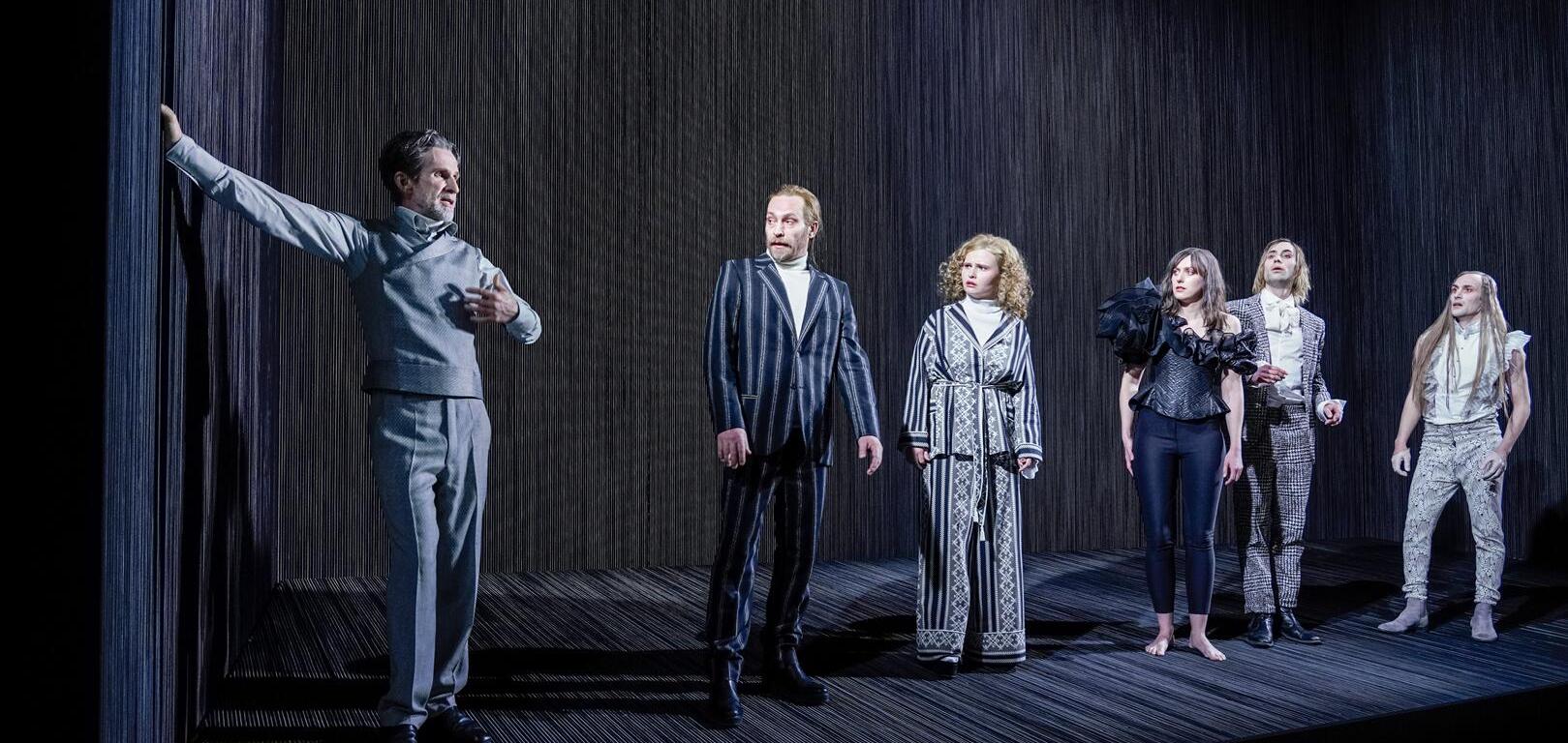 Anne Lenk platziert mithilfe des Bühnenbildners Florian Lösche das Geschehen in eine Art Guckkasten, der aus unzähligen vertikal gespannten, elastischen Gummibändern besteht. Alles wird in Grau und Schwarz gehalten. Sibylle Wallum kleidet die Schauspieler und Schauspielerinnen in zeitgenössischer Mode. Kostüme und Kulisse wirken beinahe düster. Aber die Stimmung auf der Spielfläche ist alles andere als düster – zumindest für das Publikum. Es entsteht eine Mischung aus Spannung und Komik der Handelnden. Der Hergang könnte sich auch sehr gut in der aktuellen Zeit abspielen. Menschen nähren sich gegenseitig von Klatsch und Tratsch im Internet, wollen überall angesehen werden, unabhängig davon, ob sie mit ihren Taten und Aussagen ihrem Ruf schmeicheln oder schaden. Stichworte hierfür sind Social Media und Trash-TV. Das Einzige, was in der Produktion nicht so recht der Aktualität entspricht, ist die ursprüngliche Reimform von Molière (ins Deutsche übersetzt von Jürgen Gosch und Wolfgang Wiens), in der das Stück von den Schauspielern und Schauspielerinnen vorgetragen wird. Es ist kein Rezitieren eines dichterischen Textes im klassischen Sinne. Ganz im Gegenteil. Der Cast jongliert mit den Versen so präzise und pointiert, ohne sie dabei zu überspitzen. Das ist eine Kunst, die alle Beteiligten auf der Bühne hervorragend beherrschen und den Zuschauern und Zuschauerinnen keinen gekünstelten Eindruck vermitteln.