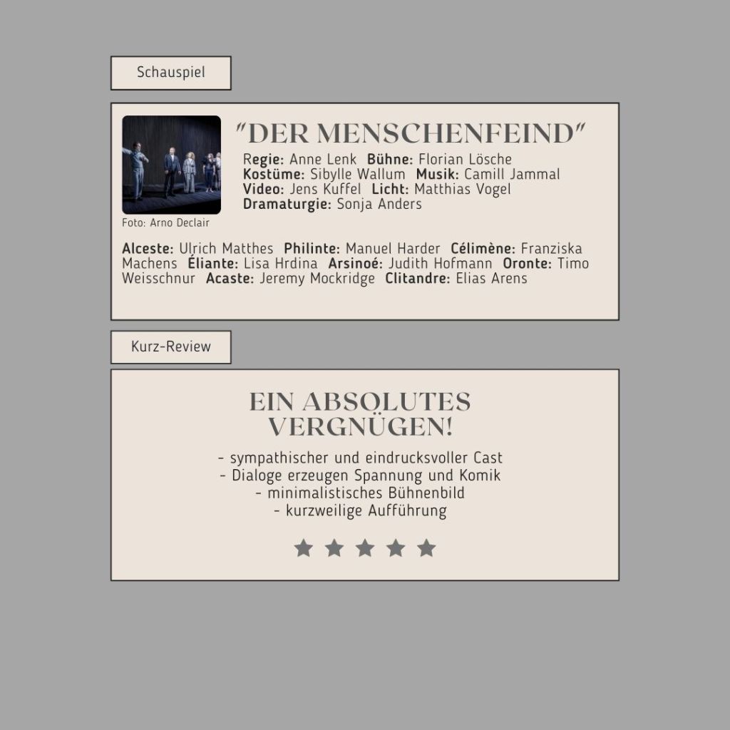 Regisseurin Anne Lenk bringt mit ihrer Inszenierung von „Der Menschenfeind“ am Deutschen Theater ein Stück auf die Bühne, das auf satirische Weise soziale Problematiken aufweist, die über Jahrhunderte Bestand in der Gesellschaft haben. Welche Position möchte jeder Einzelne im Leben einnehmen? Welche Werte sind wem besonders wichtig? Muss man Everybody’s Darling sein? Ist es erlaubt, zu seiner eigenen Meinung zu stehen, auch wenn man nicht auf Zustimmung des Gegenübers stoßen wird? Muss man zu jedem Thema seinen eigenen Senf dazugeben oder ist es auch mal okay, wenn man sich enthält? Zu all diesen Fragen gibt es hervorragende Darstellungen und Interpretationen zu der von Moliéres erschaffenen Figuren auf der Bühne. Das Stück lebt von der schauspielerischen Leistung des Casts und schafft es auf unbeschwerte, spöttelnde und äußerst amüsante Weise, das Publikum gänzlich in seinen Bann zu ziehen. Der sprachliche Aspekt ist zudem ein absoluter Hochgenuss. Allein deswegen empfiehlt sich diese Produktion bestens für einen Klassenausflug. Obendrein lassen sich hervorragende Parallelen zur Gegenwart ziehen. Jedoch nicht nur aufgrund der Oberthematiken, sondern auch wegen der fantastischen Darstellung emanzipierter Frauen. Ein zeitloser Klassiker, der Spaß macht.