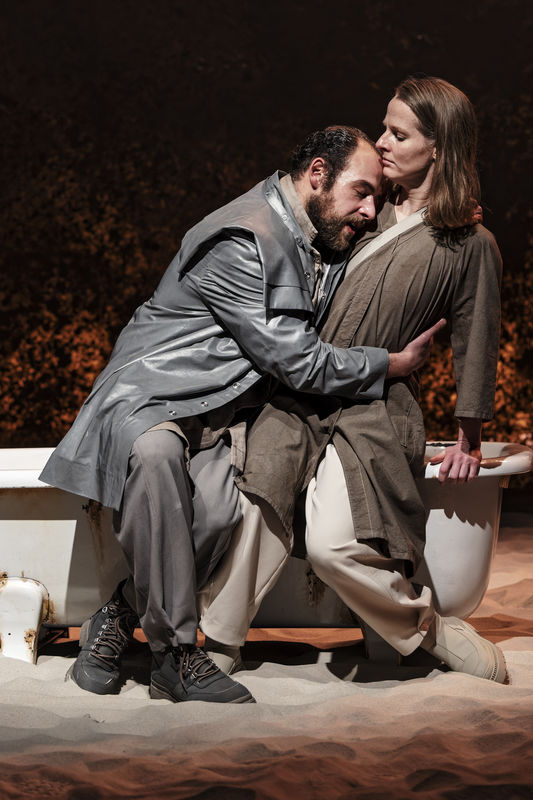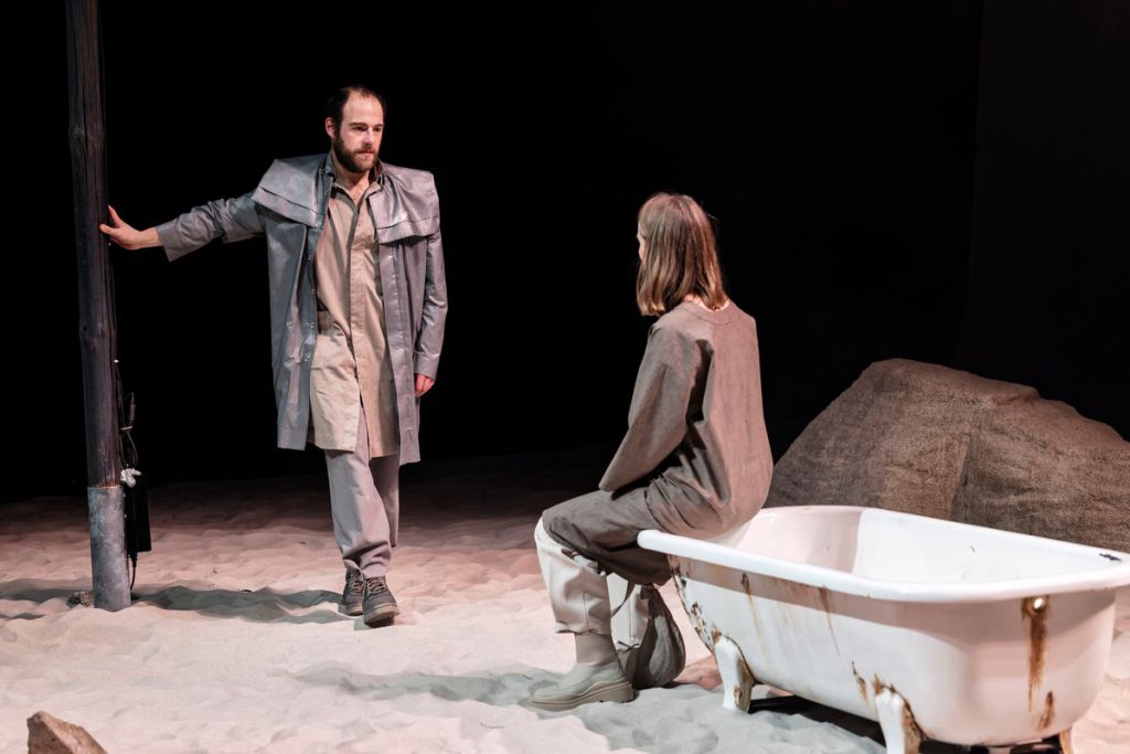 Obwohl die Inszenierung immer wieder unerwartete Wendungen nimmt und somit auch neue Themen aufgemacht werden, wirkt das Stück keineswegs überladen und vollgestopft, als hätte man alle erdenklichen Red Flags versucht, in die 90 Minuten des Schauspiels zu quetschen. Starikow schafft es mit ihrer Interpretation, das Publikum nicht zu überfordern, aber dafür gehörig auf den Zahn zu fühlen und Raum für die eigene Reflexion zu geben. Während man einerseits hofft, dass jeder der beiden Akteure sein ganz persönliches Happy End finden wird, spürt man stellenweise, wie erdrückend und unangenehm manche Darstellungen für einen selbst sind. Das minimalistisch gestaltete Bühnenbild von Simon Lesemann lenkt den Fokus direkt auf die beiden Schauspieler und deren Handlung, hinterlässt allerdings auch eine Schwere, die zu dem Drama passt. Der Sandpark, der fast einer Wüste gleicht, und die Badewanne als Bank lassen sich hier hervorragend auf die ertränkende Sehnsucht und tiefe Verzweiflung, in die Avdics und Schuberts Figuren regelrecht ertränken, übertragen. Das Stück wird in den meisten Fällen mit Sicherheit Nachwirkungen bei einzelnen Besuchern aufweisen. Die anderthalb Stunden Spieldauer vergehen zudem auch wie im Fluge und weisen absolut keine unnötigen Längen auf. Kurz gesagt: Hier sind Thema und Schauspiel einfach on Point.