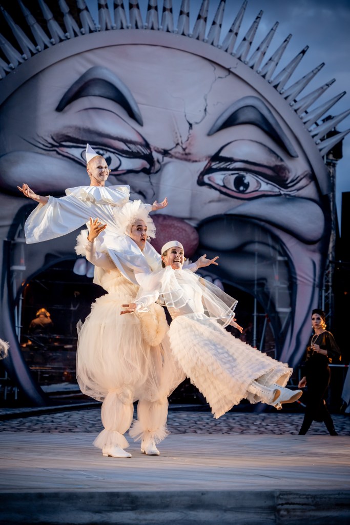 Mit „ohnehin schon viel los“ sind vor allem die Gestalten gemeint, die im Vergnügungspark Phantasma herumtänzeln. Die skurrilen Attraktionen kommen meist in weißen und/oder schwarzen Gewändern und clownsmäßig gestalteten Gesichtern daher – nur eher mit schwarzer Farbe, das den Grusel-Faktor ein wenig erhöht. Die Kostüme von Tanja Liebermann sind farblich gesehen oftmals entsättigt, was sehr gut zum Stimmungsbild passt. Sie ähneln oftmals dem Vaudeville-Stil. Die Pariser treten oftmals in hellen, edlen Kleidungsstücken aus dem 19. Jahrhundert auf. Meg ist dabei die Einzige aus dem Cast, die dauerhaft in lebendigen bunten Farben mit stellenweise auffälligen Mustern die Bühne betritt. Jedoch ändert sich das farbliche Stimmungsbild ihrer Kleidung auch zum Ende der Aufführung hin. Doch Liebermanns abwechslungsreiche Kostüme sind ein absoluter Hingucker, die vielleicht viel mehr Aufschluss über die jeweiligen Gemütszustände oder die jeweilige Verfassung der jeweiligen Handelnden auf der Bühne aufweisen, als das Publikum im ersten Moment annehmen mag.